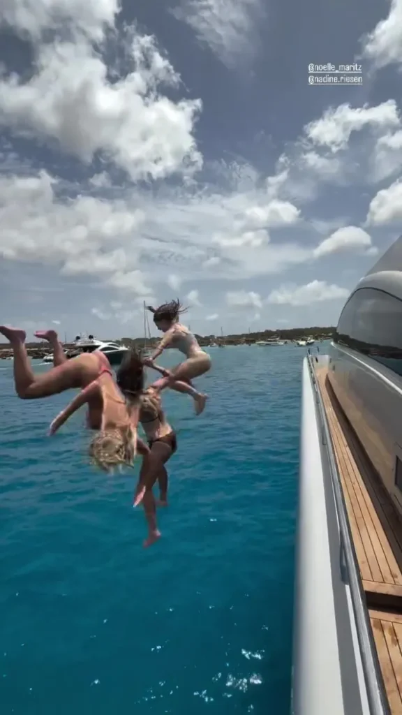 In a clip shared with her followers, the forward showcased her athleticism by launching herself off the yacht with a perfectly executed backflip into the crystal-clear water below. The stylish dive highlighted not only her playful holiday mood but also the agility and balance that define her football career.