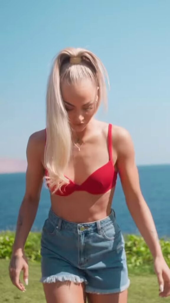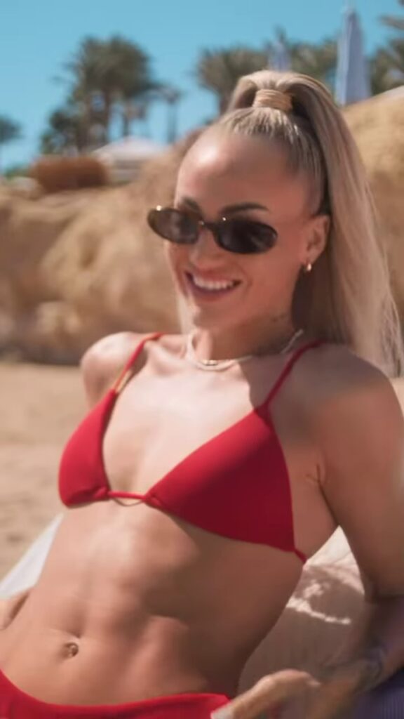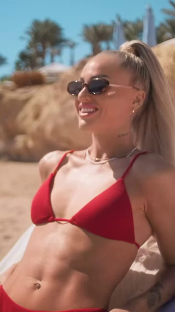 Wearing a bold red bikini for an advert with Italian brand Tezenis, Lehmann highlighted her toned physique and confident presence on the sand. The vibrant two-piece stood out against the coastal backdrop, emphasizing both her athletic build and the energetic spirit of the shoot.