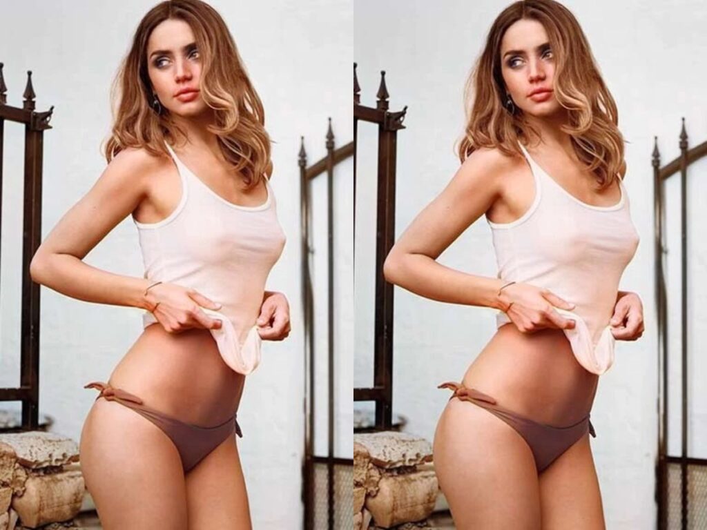The collection features a range of standout looks. In one frame, de Armas wears a black deep-neck ensemble, projecting a polished yet daring aesthetic characteristic of her red carpet appearances. Another image captures her in a butterfly-style bralette on a balcony set, where bold styling choices pair with defined makeup and poised posture to create a dramatic scene.